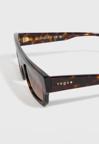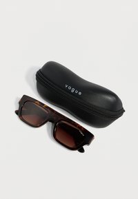 Ορθογώνια γυαλιά ηλίου tortoiseshell με καφέ φακούς με διαβάθμιση και χρυσή επωνυμία "Vogue" στα πλαϊνά και στη γωνία του φακού.