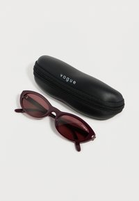 Γυαλιά ηλίου σε στυλ cat-eye με σκούρο μοβ σκελετό και φακούς με χρωματισμό, με το λογότυπο "Vogue" ορατό στους βραχίονες και στον φακό.