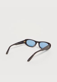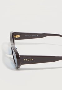 Μαύρα στενά οβάλ γυαλιά ηλίου με φακούς με μπλε απόχρωση και το λογότυπο «vogue» στο πλάι, ακουμπισμένα σε ανοιχτό γκρι επιφάνεια.