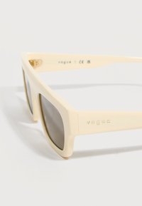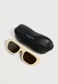 Κρεμ ορθογώνια γυαλιά ηλίου με σκοτεινούς φακούς και το λογότυπο Vogue στη γέφυρα και στο φακό, εμφανιζόμενα πάνω σε λευκό φόντο.