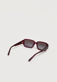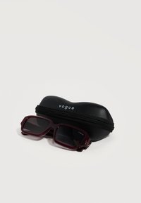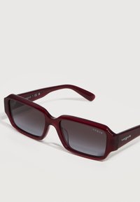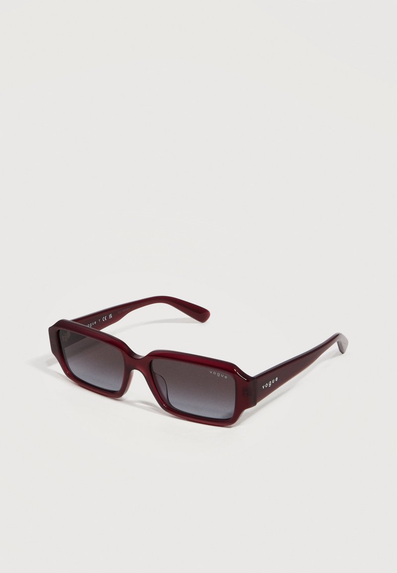 Ορθογώνια, σκουρόχρωμα κόκκινα γυαλιά ηλίου με σταδιακά σκουρόχρωμους φακούς και λογότυπο "vogue" στο πλάι, εμφανιζόμενα σε απλό ανοιχτό φόντο.