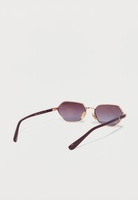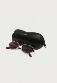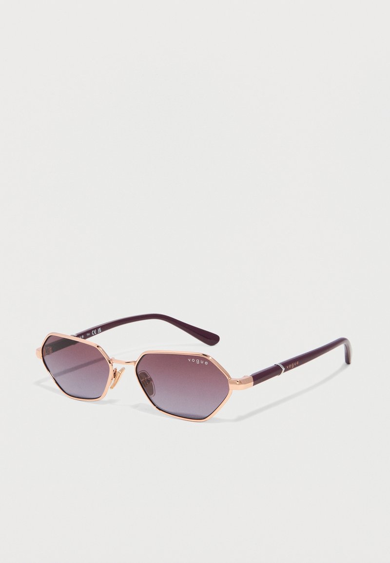 Εξαγωνικά γυαλιά ηλίου με μεταλλικό πλαίσιο σε ροζ χρυσό, σκοτεινούς μοβ φακούς με διαβάθμιση, μοβ βραχίονες και λογότυπο "Vogue" στους φακούς και τους βραχίονες.