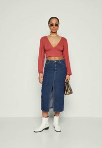 Κομμένο τοπ σε  rust απόχρωση με βαθύ V-λαιμόκοψη και μακριά φουσκωτά μανίκια, συνδυασμένο με τζιν μολυβένια φούστα που διαθέτει μπροστινή σχισμή και κλείσιμο με κουμπί.