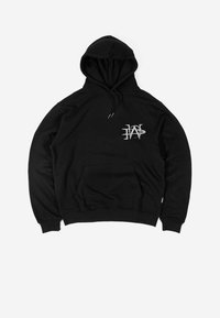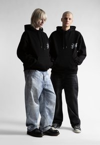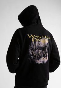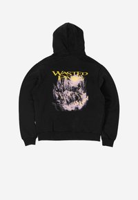 Δύο άτομα στέκονται με την πλάτη στην κάμερα φορώντας μαύρα φούτερ με κουκούλα, με την επιγραφή "WASTED PARIS" και ένα γραφικό με άλογα και αναβάτες σε ένα ομιχλώδες δάσος.