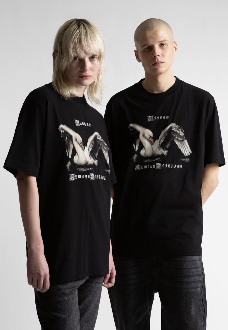 Δύο νέοι ενήλικες που φορούν μαύρα φαρδιά T-shirts με μεγάλο σχέδιο κύκνου και γοτθικό κείμενο, στέκονται μπροστά σε ένα απλό φωτεινό φόντο.