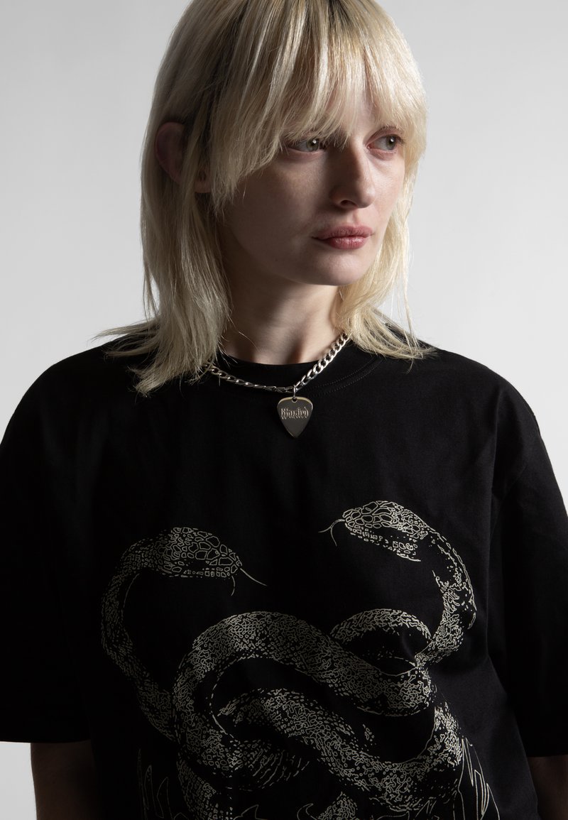 Νεαρός με ξανθά μαλλιά κοιτάζει προς τα δεξιά, φοράει μαύρο πουκάμισο με γραφικό δύο φιδιών και ασημένιο κολιέ με μενταγιόν σε σχήμα καρδιάς.