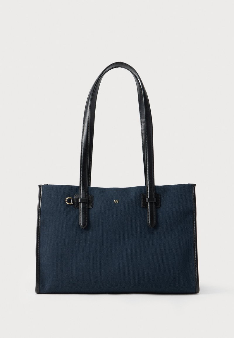 Κοντινή όψη υφασμάτινης τσάντας tote σε ναυτικό μπλε με υφή, με μαύρες δερμάτινες λαβές και μικρό χρυσό λογότυπο "W" στο πάνω δεξιά μέρος.