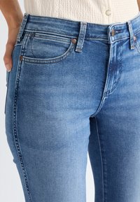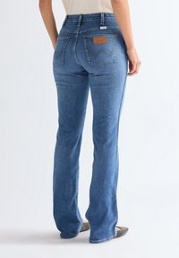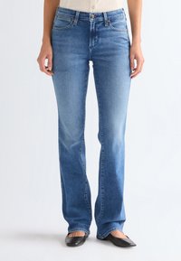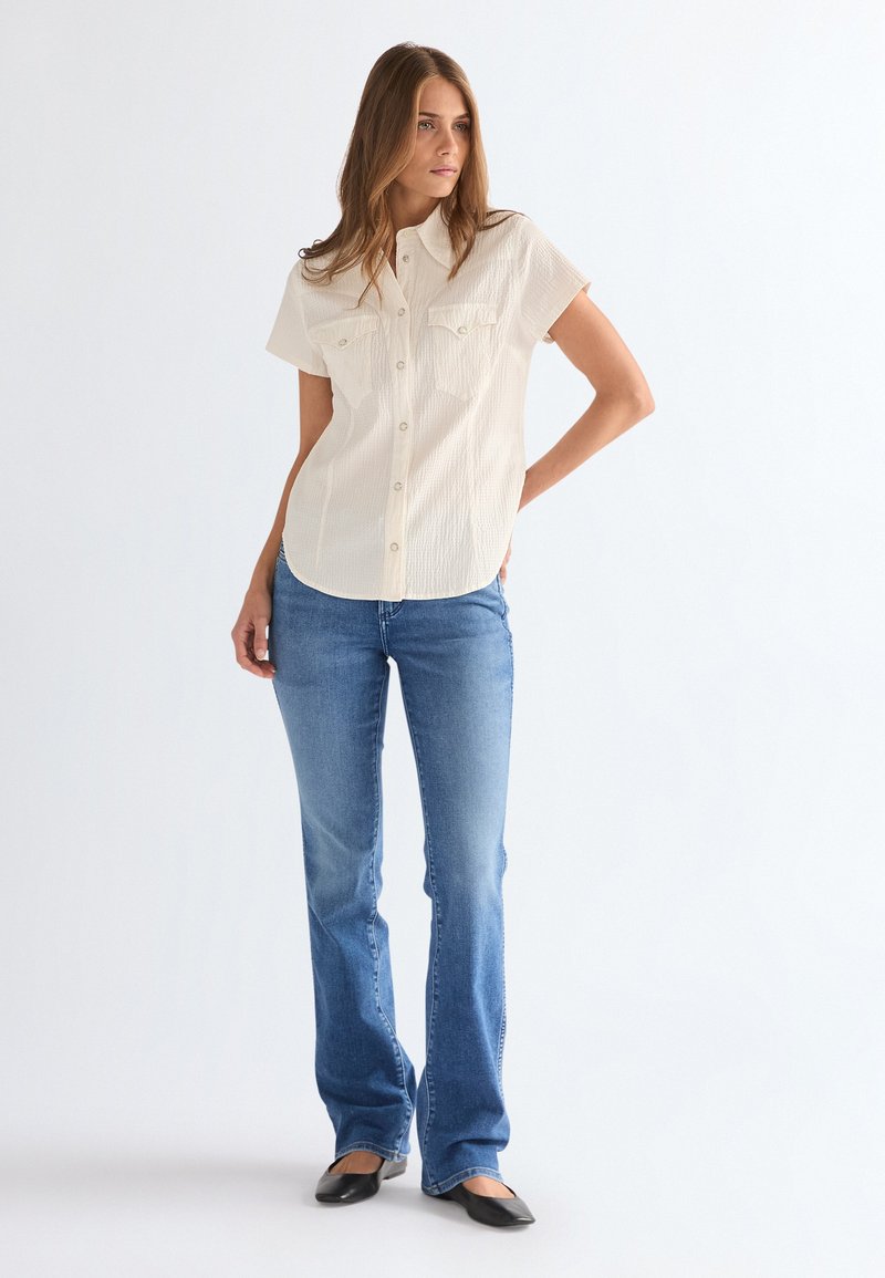 Γυναίκα που στέκεται, φοράει κοντομάνικο, εκρού πουκάμισο με κουμπιά, μπλε παντελόνι bootcut και μαύρα μυτερά φλατ παπούτσια, σε λευκό φόντο.