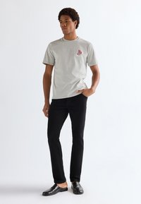 Άνδρας που φορά μαύρο τζιν στενής εφαρμογής και μαύρα δερμάτινα παπούτσια χωρίς κορδόνια, στέκεται μπροστά σε απλό ανοιχτό φόντο.