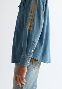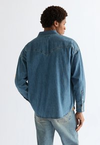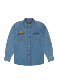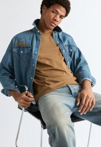 Νεαρός άνδρας που φοράει μπλε τζιν πουκάμισο με κεντημένες τσέπες στο στήθος, κοιτάζοντας ελαφρώς προς τα δεξιά πάνω σε απλό φωτεινό φόντο.