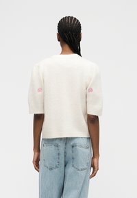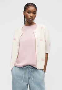 Γυναίκα με πλεξούδες, φορώντας ένα λευκό ζακέτα με κουμπιά και ροζ σχέδια πάνω από ένα ανοιχτό ροζ πουλόβερ και ανοιχτό μπλε τζιν.