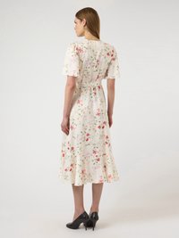 Γυναίκα που φοράει κρεμ φόρεμα τύπου wrap με ροζ λουλουδάτο σχέδιο και αέρινες μανσέτες, συνδυασμένο με μαύρα παπούτσια με τακούνι, στέκεται μπροστά σε απλό φόντο.