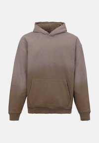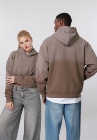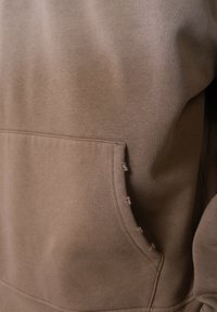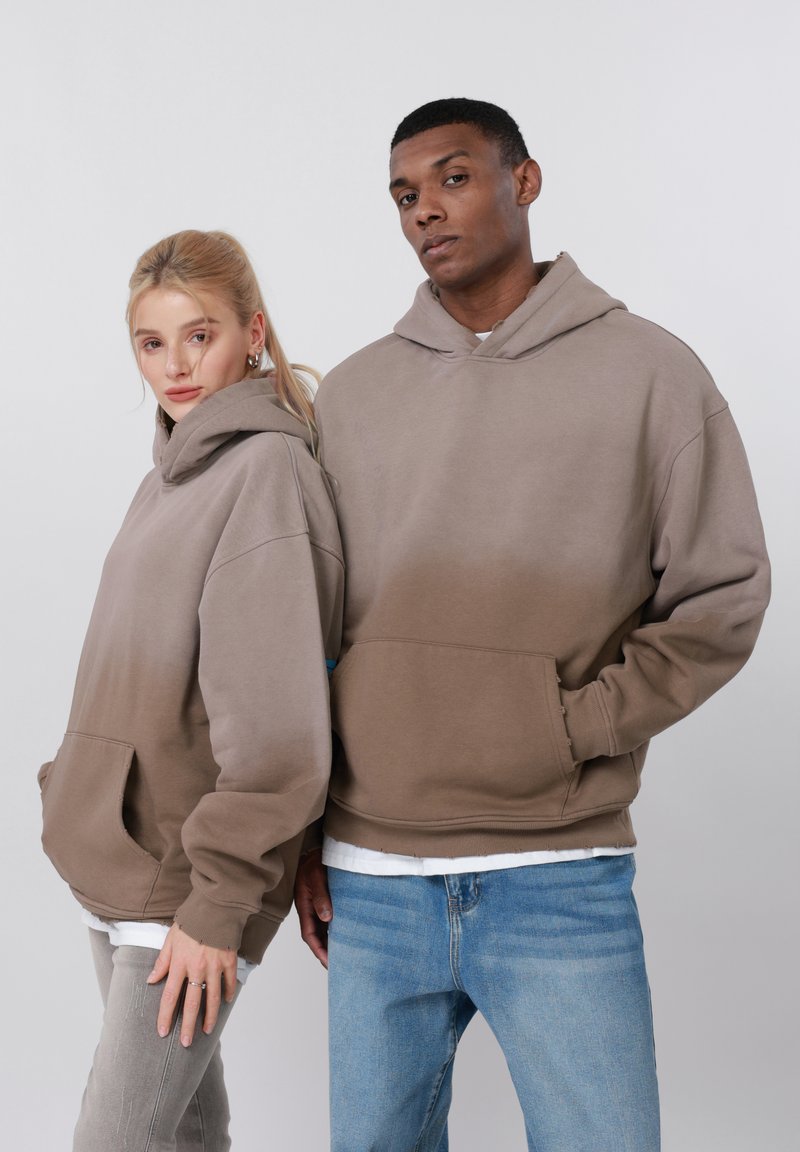 Δύο ενήλικες που φοράνε μπεζ φούτερ με κουκούλα, στέκονται δίπλα-δίπλα μπροστά σε ένα απλό ανοιχτόχρωμο φόντο, με χαλαρή έκφραση.