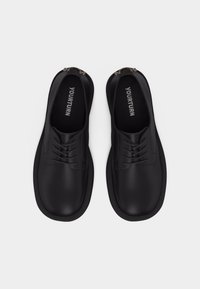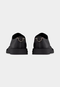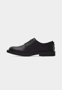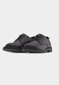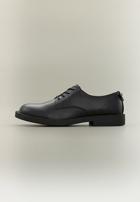 Μαύρο ανδρικό παπούτσι Oxford από δέρμα με κλειστό κορδόνι, στρογγυλή μύτη, χαμηλό τακούνι και ταινία έλξης στο πίσω μέρος σε ουδέτερο φόντο.