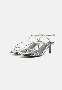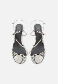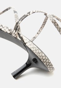 Πέδιλο με ψηλό τακούνι και λουράκια με σχέδιο δέρματος φιδιού, λεπτά λουράκια, αγκράφα στον αστράγαλο και λεπτό μαύρο τακούνι σε λευκό φόντο.