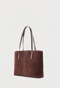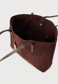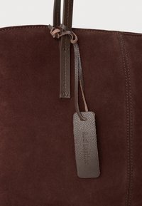 Καφέ σουέτ τσάντα ώμου με σκούρες δερμάτινες λαβές και μικρό δερμάτινο ταμπελάκι, σε απλό φωτεινό φόντο.