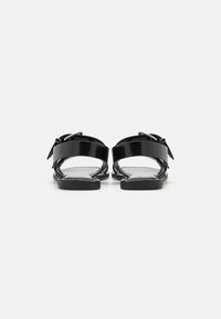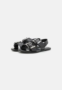 Μαύρο σανδάλι με ανοιχτό δάχτυλο, δύο ρυθμιζόμενα λουριά με χρυσά αγκράφες και λουρί στη φτέρνα, με παχύ, επενδυμένο πέλμα.