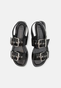 Μαύρο δερμάτινο σανδάλι με χοντρή σόλα, δύο ρυθμιζόμενα λουριά στον πέλμα, ένα λουρί γύρω από τον αστράγαλο με πόρπη σε χρυσό τόνο σε ουδέτερο φόντο.
