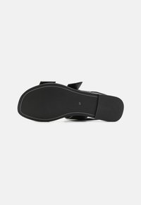 Μαύρες επίπεδες σανδάλες με φαρδύ λουράκι και ρυθμιζόμενο λουράκι στον αστράγαλο με μεταλλική αγκράφα, τοποθετημένες σε υφασμένη μαύρη σόλα.