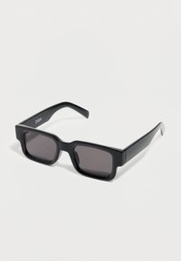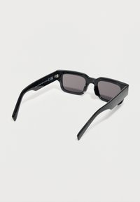 Μαύρα ορθογώνια γυαλιά ηλίου με χοντρά πλαίσια και σκούρους φακούς, ακουμπισμένα σε λευκή επιφάνεια.