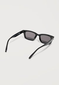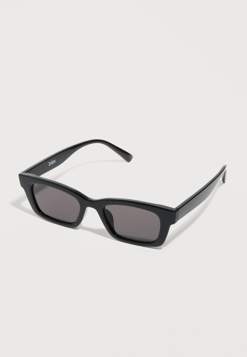 Μαύρα ορθογώνια γυαλιά ηλίου με χοντρά πλαίσια και σκουρόχρωνους φακούς που ακουμπούν σε λευκή επιφάνεια.